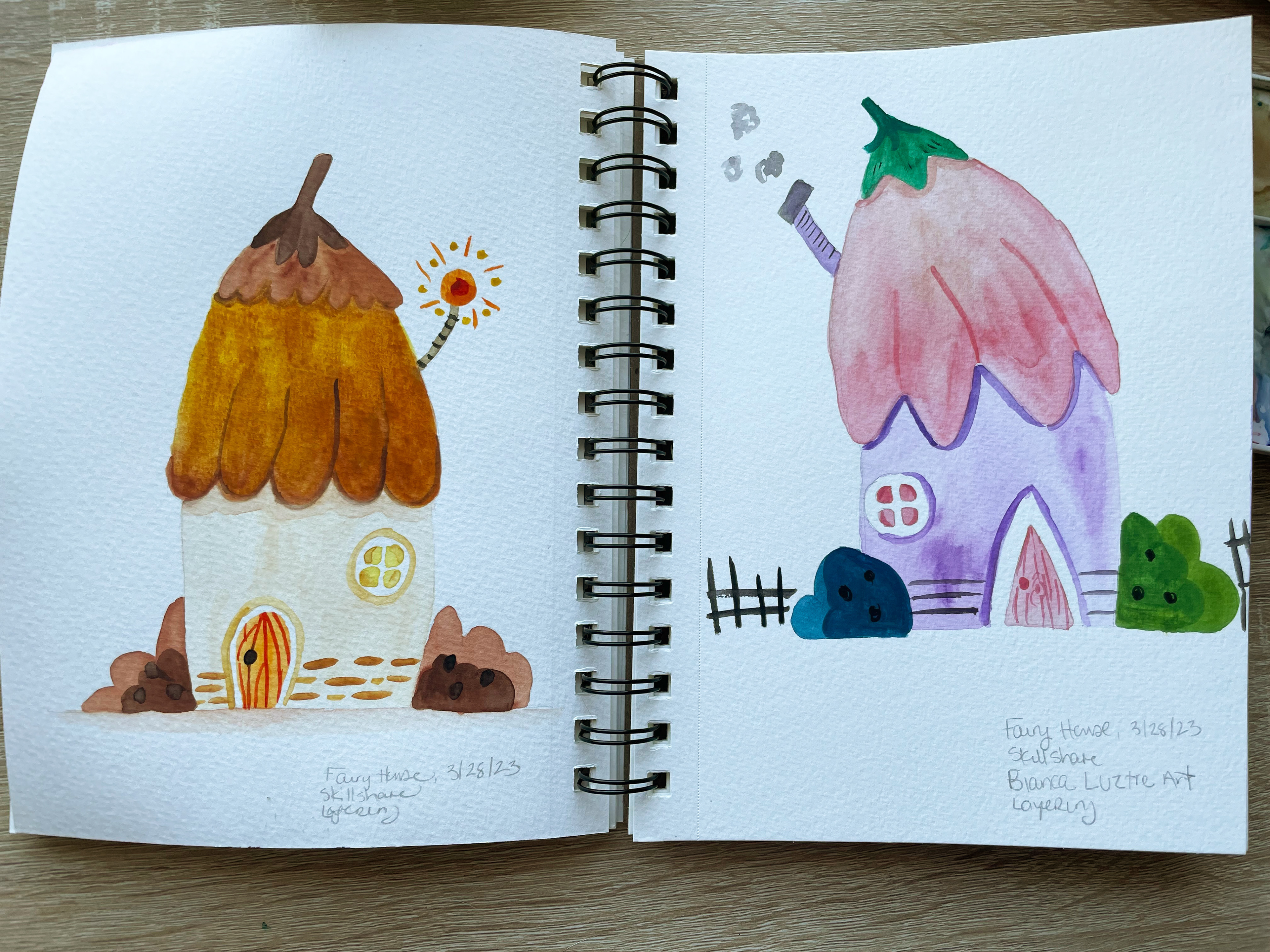 I took a Skillshare class on layering by Bianca Luztre. I loved making these fairy houses. They are so whimsical and fun! And I immediately painted some for birthday cards for some of my whimsical and fun friends!